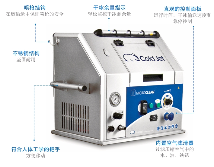 • 体积小,自带小车,方便移动 • 可拆解面板,方便维护 • 操作安全,简单 • 喷射压力可调节,高速喷射 • 使用块状干冰,干冰仓容积