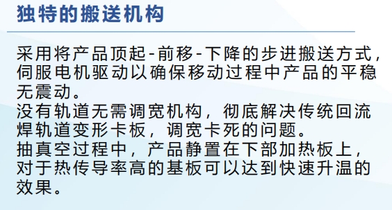 独特的步进搬送,无需轨道及调宽机构,解决传统回流焊轨道变形卡板等问题。采用上部热风下部接触式加热,弥补了全热风热传导率低,及全接触式均热性差的缺点。